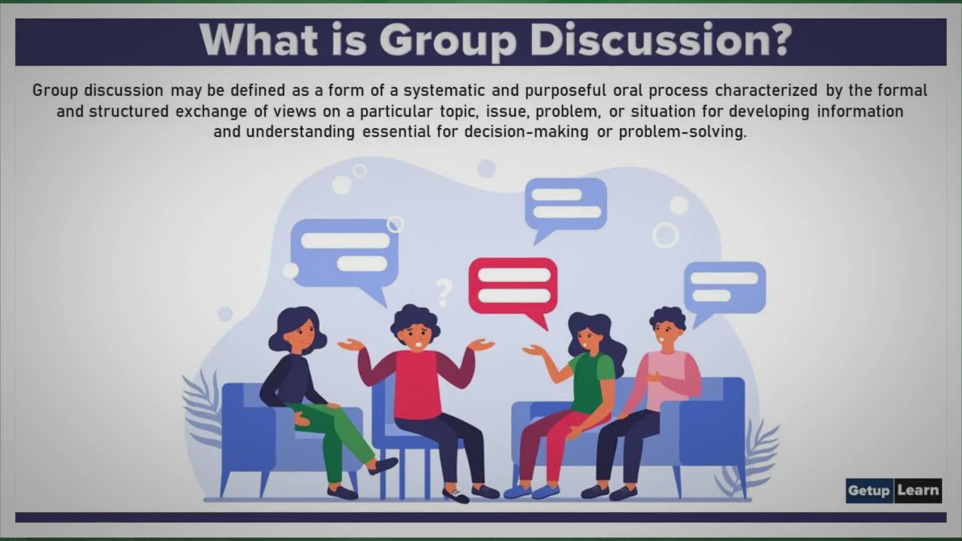 Group discussion may be defined as a form of a systematic and purposeful oral process characterized by the formal and structured exchange of views on a particular topic, issue, problem, or situation for developing information and understanding essential for decision-making or problem-solving. Group discussion is an important activity in academic, business, and administrative spheres.